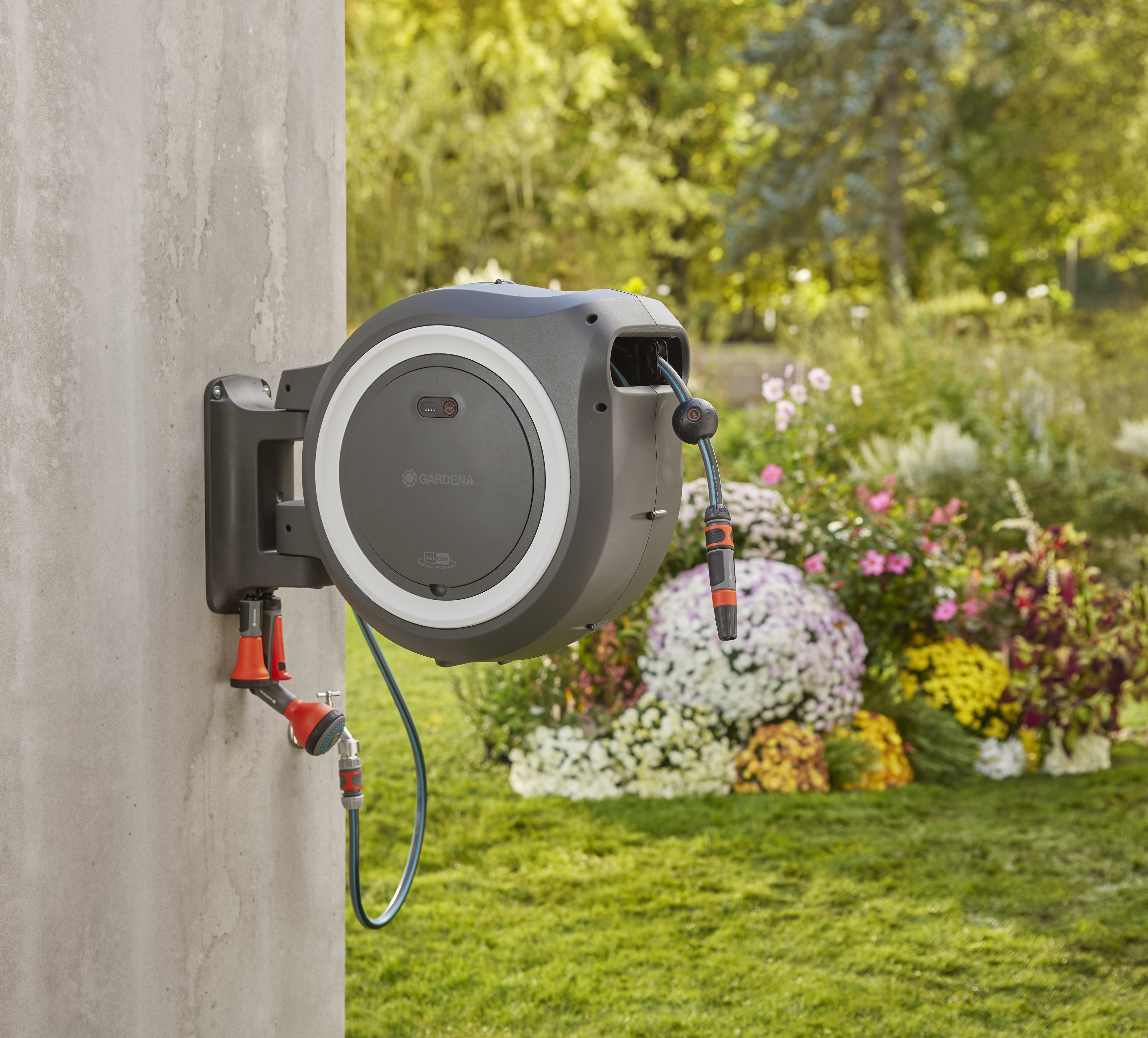 PowerRoll väggmonterad slangbox: Ger frihet och flexibilitet samt maximal bekvämlighet för bevattning. Tack vare batteriet rullas slangen automatiskt upp efter användning med endast ett knapptryck.