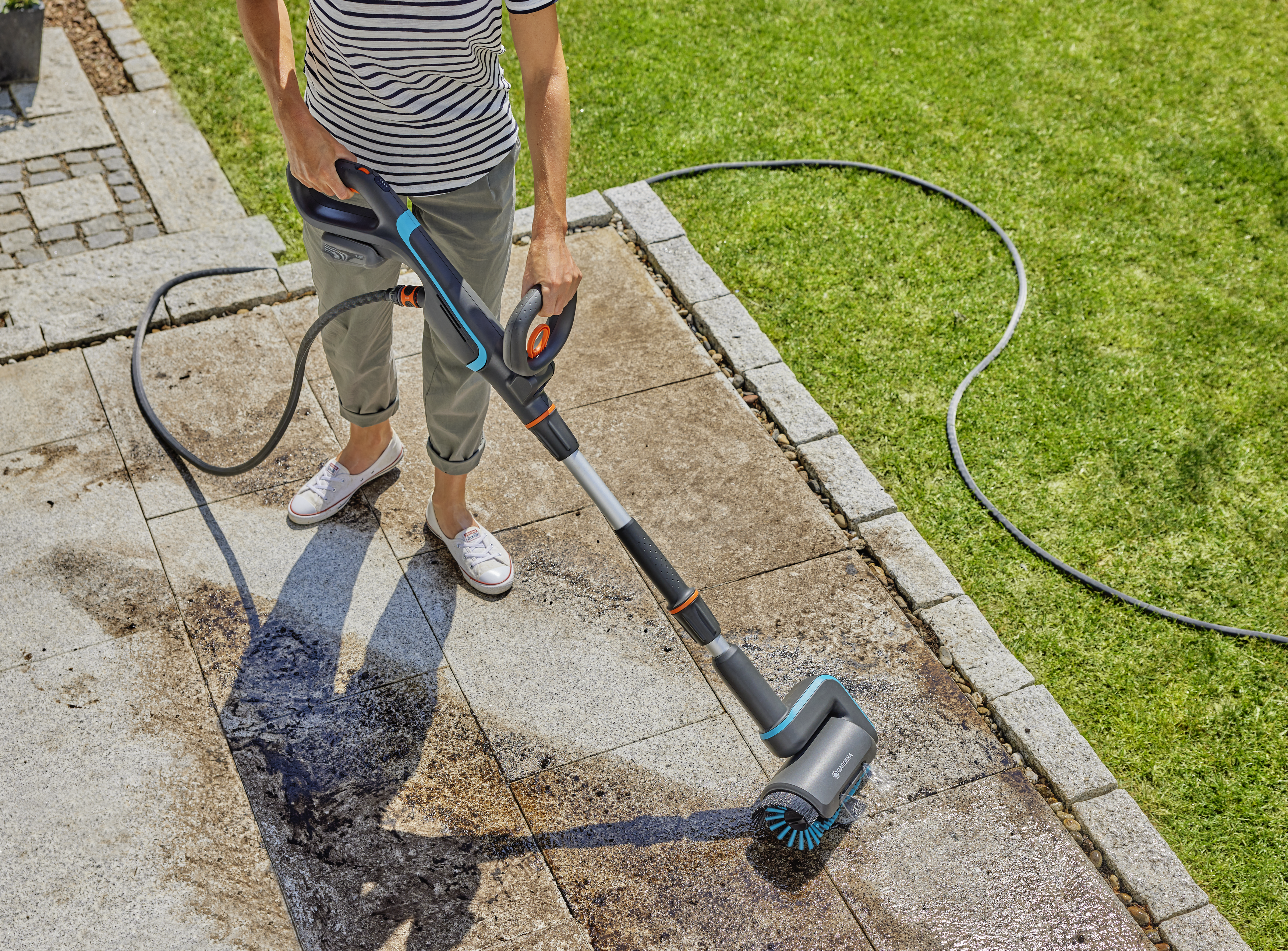 Altantvätt AquaBrush: AquaBrush kombinerar mångsidighet med prestanda för olika typer av rengöringsarbete runt huset och trädgården. Tack vare olika tillbehör kan den avvändas för rengöring på olika ytor som altan, stengångar och utemöbler.
